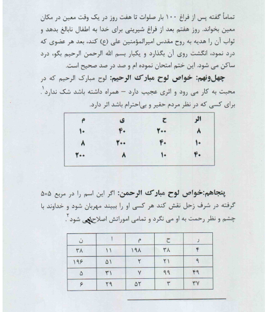 در باب علم کیمیا، علم سیمیا، علم ریمیا، علم لیمیا، علم هیمیا، در باب طلسمات مجربه و احضارات جن و…، تسخیرات کواکب، دعای مهر و محبت، باطل کردن طلسمات، نام ماه ها و ایام هفته کواکب، خواص منازل قمر، نامهای کواکب (شمس، قمر، مریخ، عطارد، مشتری، زهره، زحل)، مزاج و طبایع بروج، برای زبان بندی، برای گشایش کار و صدها موضوع دیگر